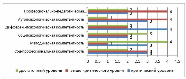 Учитывая данный факт, мы видим, что по всем направлениям ППК у молодых педагогов достаточно высокий уровень, в то же время у педагогов, уже имеющих некоторый опыт педагогической деятельности, показатели либо чуть выше критического уровня, либо имеют критический уровень.