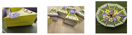 «Орфографический торт» выполнен из тонкого картона по шаблону. На магнитах прикрепляется к доске. В «торте» 10 кусочков по количеству букв слова «орфограмма». На каждой боковой стороне кусочка записаны слова с пропущенной буквой на одну орфограмму. На «липучках» 10 карточек с определением орфограммы, которые прикрепляются по краям кусочка торта, и 10 украшений в виде цветка с порядковым номером. На стороне каждого кусочка приклеена буква слова «орфограмма».
