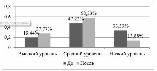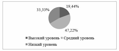 Анализируя данные сравнительного анализа на контрольном этапе экспериментальной работы, можно сделать вывод, что высокий уровень проверяемого когнитивного критерия читательской компетентности повысился с 19,44% (7 чел.) обучающихся на 8% и составил 27,77% (10 чел.). Средний уровень повысился с 47,22% (17 чел.) на 11% и составил 58,33% (21 чел.). Низкий же уровень понизился с 33,33% (12 чел.) на 19% и составил 13,88 % (5 чел.).