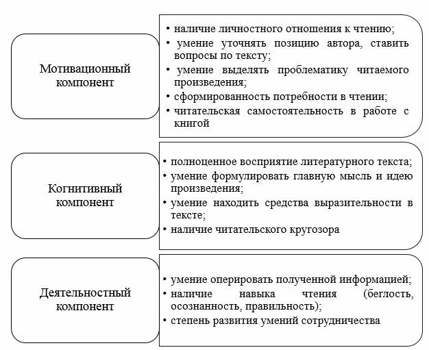 Е.Л. Гончарова в своем исследовании, посвященном развитию читательской компетентности младших школьников [10], говорит о «возможности формирования читательской компетентности при условии взаимосвязи и сформированности следующих компонентов: