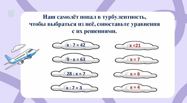 Учитель: Ребята, наш самолёт двигался по разным траекториям и попал в турбулентность. Чтобы выбраться из неё, нам необходимо сопоставить уравнения с их решением.