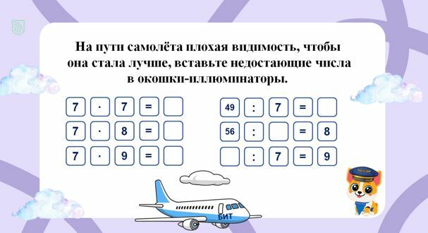 Учитель. Верно, ребята. Вы справились с этим заданием. Но вот беда, на пути нашего самолёта плохая видимость. Чтобы все облака рассеялись, нам необходимо справиться с ещё одним заданием. Нужно вставить в недостающие окошки верные числа. А полученные равенства необходимо записать в тетрадь.