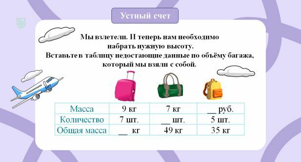 Учитель: Благодаря тому, что вы успешно выполнили задание, наш самолёт взлетел. Теперь нам необходимо набрать нужную высоту. Для этого вам необходимо вспомнить изученную тему и правильно заполнить недостающие данные по объёму багажа, который мы взяли с собой в наш самолёт.