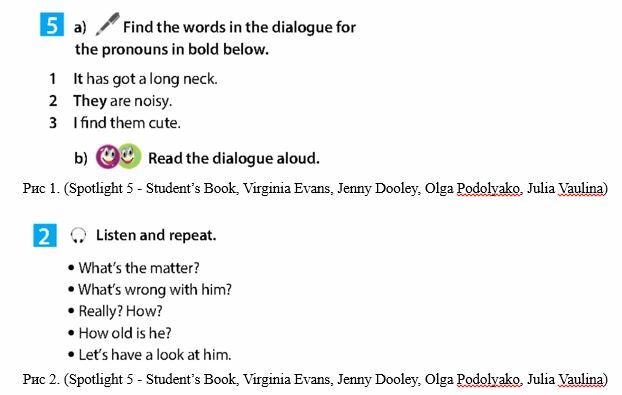 В учебниках Spotlight и Starlight часто используются задания формата «Listen and repeat», связанные с диалогами на основе типичных повседневных ситуаций. Данный формат упражнений включает аудиоматериалы, которые требуют от учащихся немедленного повторения услышанных фраз или предложений с целью улучшения произношения и беглости речи. Более того, в некоторых разделах упражнения дополнены отдельными заданиями, на отработку ударных и неударных слогов или слов, ассимиляции, соединительных звуков, элизии и т.п.. Такие задания помогают обучающимся лучше воспринимать и воспроизводить фразы на слух, улучшая их способность понимать и использовать язык в реальных ситуациях.