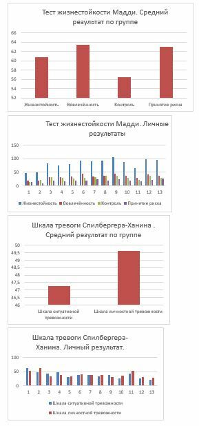 Результаты двух методик соотносятся друг с другом. Те участники, которые имеют высокий уровень тревожности обладают также низкими уровнями жизнестойкости, вовлеченности, контроля или принятия риска. Средние и/или высокие показатели по тесту жизнестойкости Мадди соотносятся с средними или высокими результатами по шкале тревоги Спилбергера-Ханина.