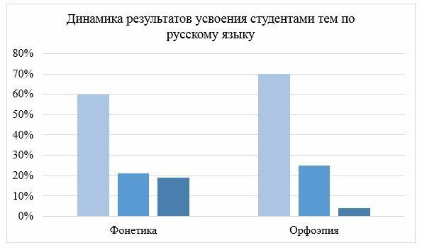 Проверочная работа и анализ усвоения данного материал показывает, что 71% студентов усвоили данную тему. Это на 10% больше, чем показатель усвоения предшествующей темы «Фонетика – наука о звучащей речи», занятие по которой было подготовлено без использования ИИ технологий (рис.1). Также 25% поняли материал, но у них остались некоторые уточняющие вопросы. И лишь у 4% обучающихся возникли затруднения.