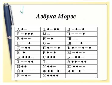 Ключ: на доске или в раздаточном материале таблица азбуки Морзе.