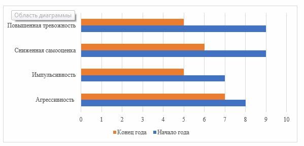 Анализ результатов итоговой диагностики в мае 2025 года показал, что повышенный уровень тревожности отмечался у 5 обучающихся. Повышенная агрессивность была выявлена у 7 испытуемых из 10. Импульсивность выявлена у 5 обучающихся из 10. Неуверенность в себе, и сниженная самооценка выявлены у 6 обучающихся из 10. Сравнительный анализ представлен на рисунке 2.