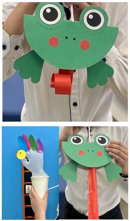 Тренажеры для дыхательных тренировок я изготавливаю собственноручно из доступных материалов. Для изготовления тренажера «Лягушка» я использую зеленый картон для головы лягушки и красную цветную бумагу для языка, клей, коктельную трубочку. Для изготовления тренажера «Петушок» мне потребовался картонный стакан, плотная перчатка, скотч, цветная бумага, коктельная трубочка. Стремлюсь сочетать яркость оформления с практической функцией — способностью наглядно демонстрировать детям интенсивность воздушного потока посредством движений отдельных элементов изделия.