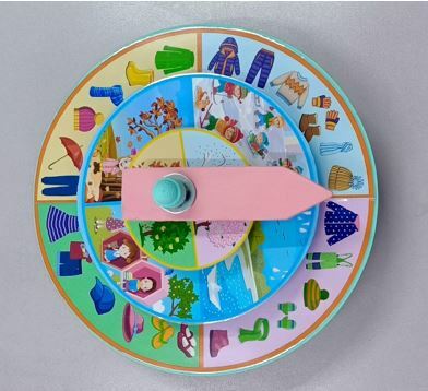 Конструкция позволяет совмещать разные комбинации изображений путём поворота отдельных кругов относительно друг друга, создавая наглядное пособие для изучения соответствия сезонов погодным условиям и выбору подходящей одежды. Материал носит развивающий характер, способствуя обучению детей распознавать природные явления и выбирать одежду соответственно климатическим особенностям различных времён года.