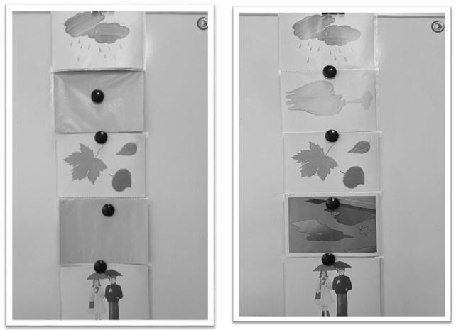 Важно, что картинки располагаются на доске сверху вниз по мере чтения текста, поскольку их количество соответствует числу предложений в рассказе (каждая картинка иллюстрирует одно предложение). Однако, поскольку мы двигаемся от простого к сложному, в текстах для детей старшего дошкольного возраста могут встречаться предложения с однородными членами. В этом случае в одном ряду может быть две картинки, а количество рядов картинок соответствует количеству предложений в тексте.