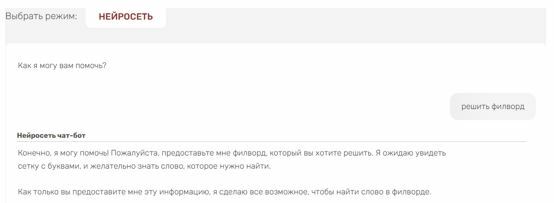 Платформа powertext.ru предоставляет возможность использования нейросетевых технологий для решения задач, связанных с филвордами. Для активации данного функционала необходимо перейти на официальный сайт платформы, выбрать режим "нейросеть", загрузить изображение филворда и указать ключевые слова, которые необходимо выделить. (Рисунок 3). В случае отсутствия заданных ключевых слов, нейросеть самостоятельно осуществляет поиск слов, скрытых в структуре филворда.