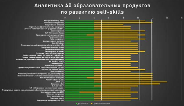 Полученные в ходе исследования данные позволяют считать, что образовательные продукты, нацеленные на развитие self-skills старшеклассников, - редко встречающийся кейс на рынке образовательных услуг: автором выявлено 40 продуктов, из которых только