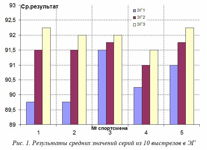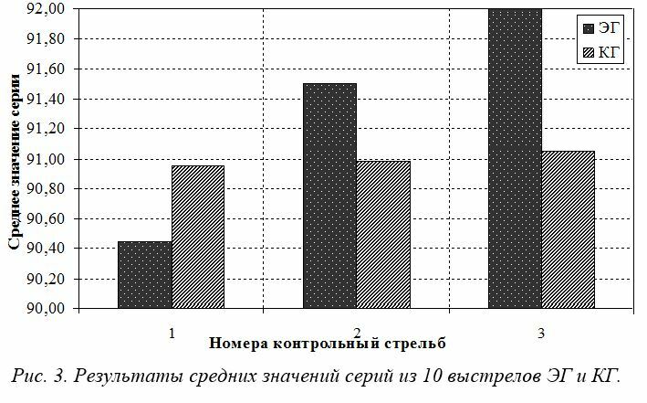 Из рис.1 следует, что в экспериментальной группе за 3 недели исследования средний результат спортсменов в серии из 10 выстрелов увеличился на 1,55 очка.