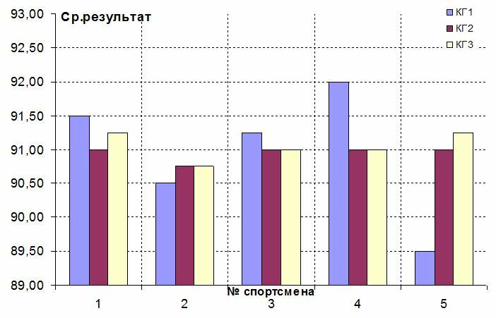 Из рис.2 следует, что в контрольной группе за 3 недели исследования средний результат спортсменов в серии из 10 выстрелов увеличился на 0,10 очка.