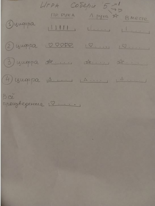 В процессе своей деятельности я придумала игру «Собери 5 палочек», «Собери 5 звезд» или можно по-современному назвать «Собери 5 лайков» (сердечек). Мой ученик предложил еще одно забавное название «Счетчик баллов». Эта игра «прижилась» на моих уроках и ученики активно ей пользуются дома, возвращая лист самоконтроля на урок с накопленными палочками, звездочками, сердцами. Ученик сам выбирает, какой вариант ему более импонирует. На уроке мы с учениками обговариваем правила игры: баллы зарабатываются только при условии безошибочного исполнения: правой рукой, затем левой и двумя руками. Ребенок превращается в честного тренера или контролера.