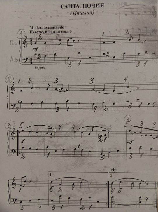 Перед началом изучения нового произведения мы с детьми обговариваем: в музыке, как и в русском языке, есть тоже фразы и предложения. Каждой музыкальной фразе соответствует цифра. Сквозной нумерацией с начала до конца произведения проставляем по порядку цифры, делим пьесу по 4 такта на фразы. Я объясняю ученику о сложности выучивания пьесы, если просто проигрывать от начала до конца. Гораздо легче учить по цифрам-фразам. Таким образом, мы начинаем в игровой форме, не заметно для самого ученика проучивать пьесу, набирая бонусы, баллы.