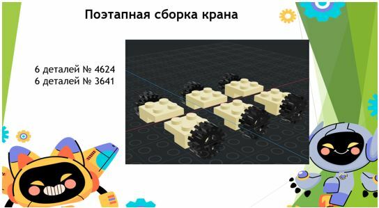 Для примера использования платформы Mecabricks был разработан виртуальный прототип экскаватора, имитирующего работу реального строительного механизма. (Рис. 5) На основе этой разработки создана учебная презентация, предназначенная для обучающихся и ориентированная на поэтапное освоение процесса проектирования. Презентация сопровождается подробным описанием используемых деталей и визуальным отображением их расположения на каждом этапе сборки. (Рис. 6)