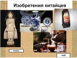 Учитель: Ребята, а что вы знаете о Китае? (изобрели компас, порох, шелк; Великий шелковый путь, пейзажная живопись; Великая Китайская стена; десятичные дроби, отрицательные числа, лунно-солнечный календарь, фарфор, ружье (в форме бамбуковых трубок), бумага, пагоды, чай, глобус небесных светил и звезд; печать книг (текст вырезали на деревянных дощечках)