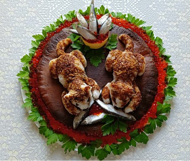 Организуем мастер-класс по оформлению пирога котятами из отварного риса, которые успешно стащили маринованную рыбку из хозяйской кадушки и довольные лакомятся ею с великим удовольствием!