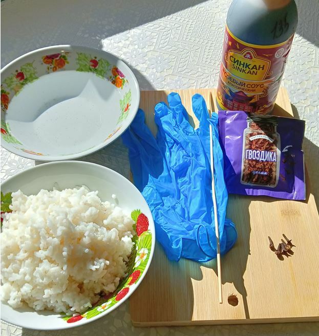 Нам потребуется следующий материал для творчества: разделочная доска, отварной рис (заменитель пластилина или глины), несколько гвоздичек для глаз и носиков наших будущих котят, деревянная шпажка для определения на нужное место мелких деталей, соевый соус для раскрашивания маленьких воришек и чашка с кипяченой водой. Спросите, зачем нам вода? Без нее не обойтись, нужно часто смачивать руки, иначе рис все время будет прилипать к ним как глина.