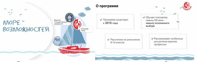 По инициативе ГК «Русский Краб» в сотрудничестве и при поддержке Министерства образования Приморского края, Министерства профессионального образования и занятости населения Приморского края, МГУ им. адм. Г.И. Невельского и Центра опережающей профессиональной подготовки реализуется проект «Море возможностей».