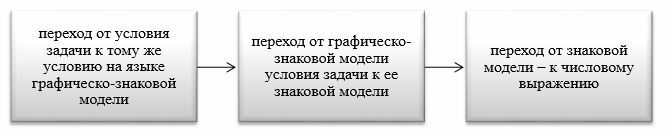 М. А. Романова справедливо полагает, что принципиально важным при проверке ответов решения задачи для деятельности моделирования является не столько выявление правильности (точности), сколько соотнесение данных, полученных на модели, с ее описанием в тексте. Поскольку перевод текста на знаково-символический язык, который приводит к построению модели, является значимым этапом решения задач и вместе с тем вызывает наибольшие трудности у обучающихся, рассмотрим его более подробно [15, с. 210].